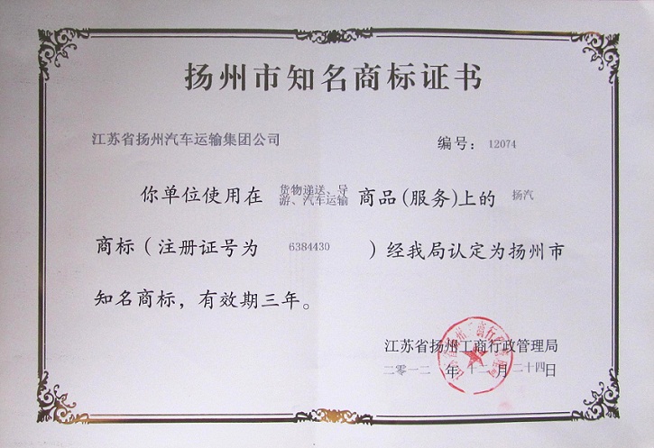 近日,集團(tuán)公司注冊的證號為6384430的“揚汽”商標(biāo)(貨物遞送、導(dǎo)游、汽車運輸)被揚州市工商行政管理局認(rèn)定為“揚州市知名商標(biāo)”。