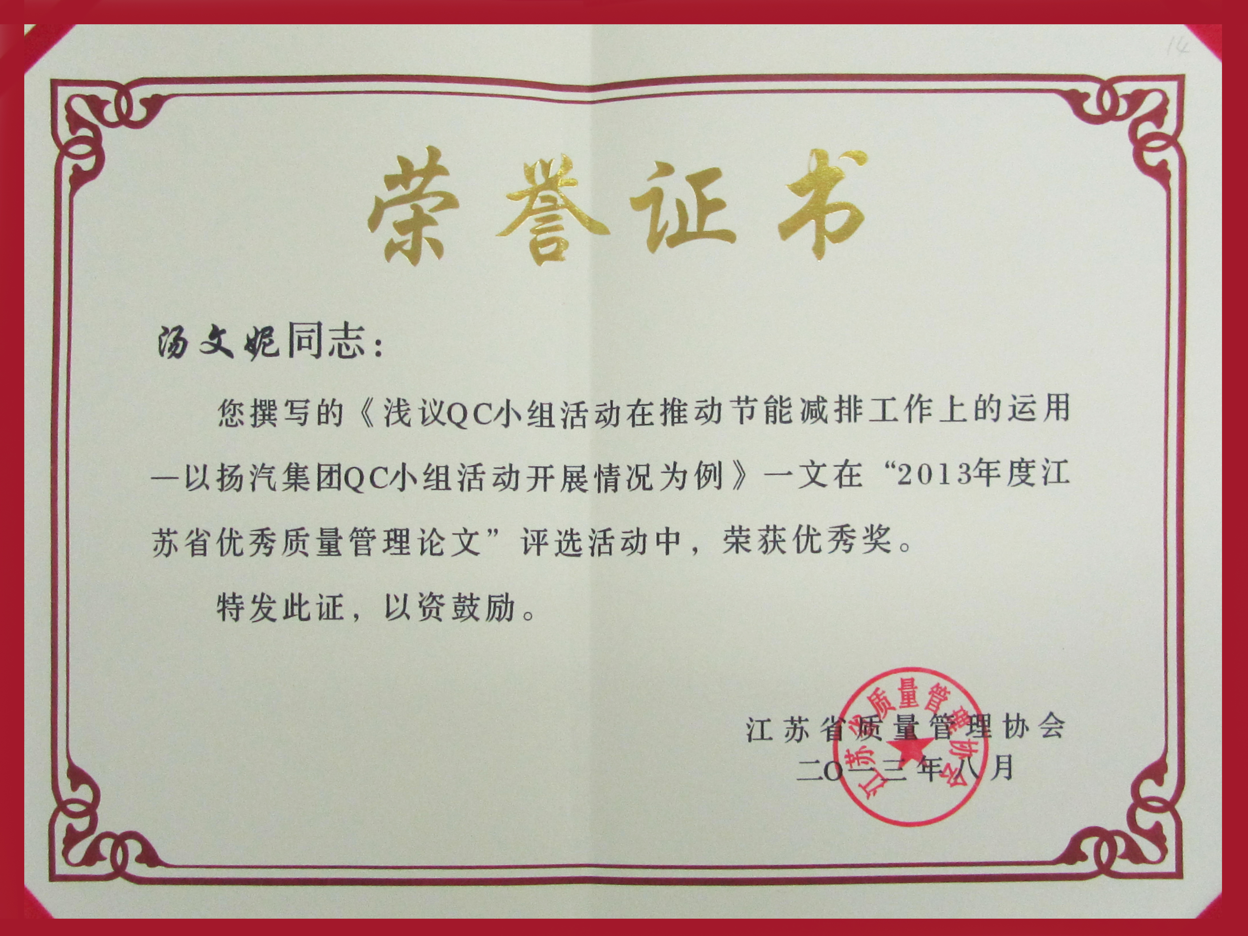 此外,集團(tuán)公司企業(yè)文化策劃處湯文妮的參賽論文《淺議QC小組活動(dòng)在推動(dòng)節(jié)能減排工作上的運(yùn)用——以揚(yáng)汽集團(tuán)QC小組活動(dòng)開展情況為例》在“2013年度江蘇省優(yōu)秀質(zhì)量管理論文”評(píng)選活動(dòng)中榮獲優(yōu)秀獎(jiǎng)。