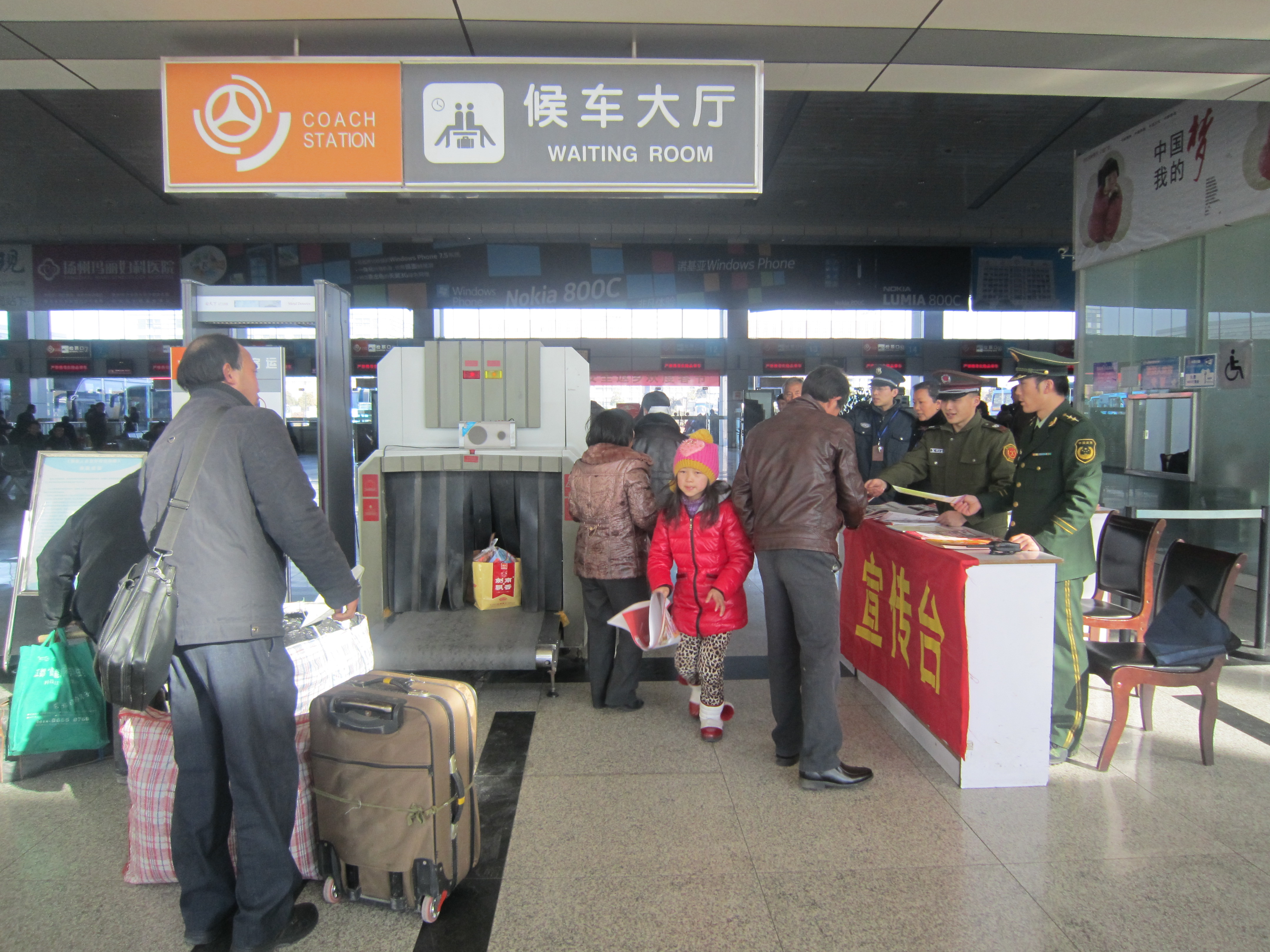 危險(xiǎn)品檢查儀旁,紅色的安全宣傳臺(tái)引人注目,武警揚(yáng)州消防支隊(duì)的幾名官兵和車(chē)站員工一起向接受危險(xiǎn)品檢查的旅客熱情發(fā)放宣傳畫(huà),并提醒在返鄉(xiāng)旅程中應(yīng)該注意的安全事項(xiàng)。幾名女官兵還走進(jìn)候車(chē)廳發(fā)放,講解遇有緊急情況時(shí)的急救逃生知識(shí)。不少旅客在候車(chē)過(guò)程中,認(rèn)真看著宣傳畫(huà),還不時(shí)交流,一旁的官兵不時(shí)接受旅客的咨詢(xún),解答他們的問(wèn)詢(xún)。