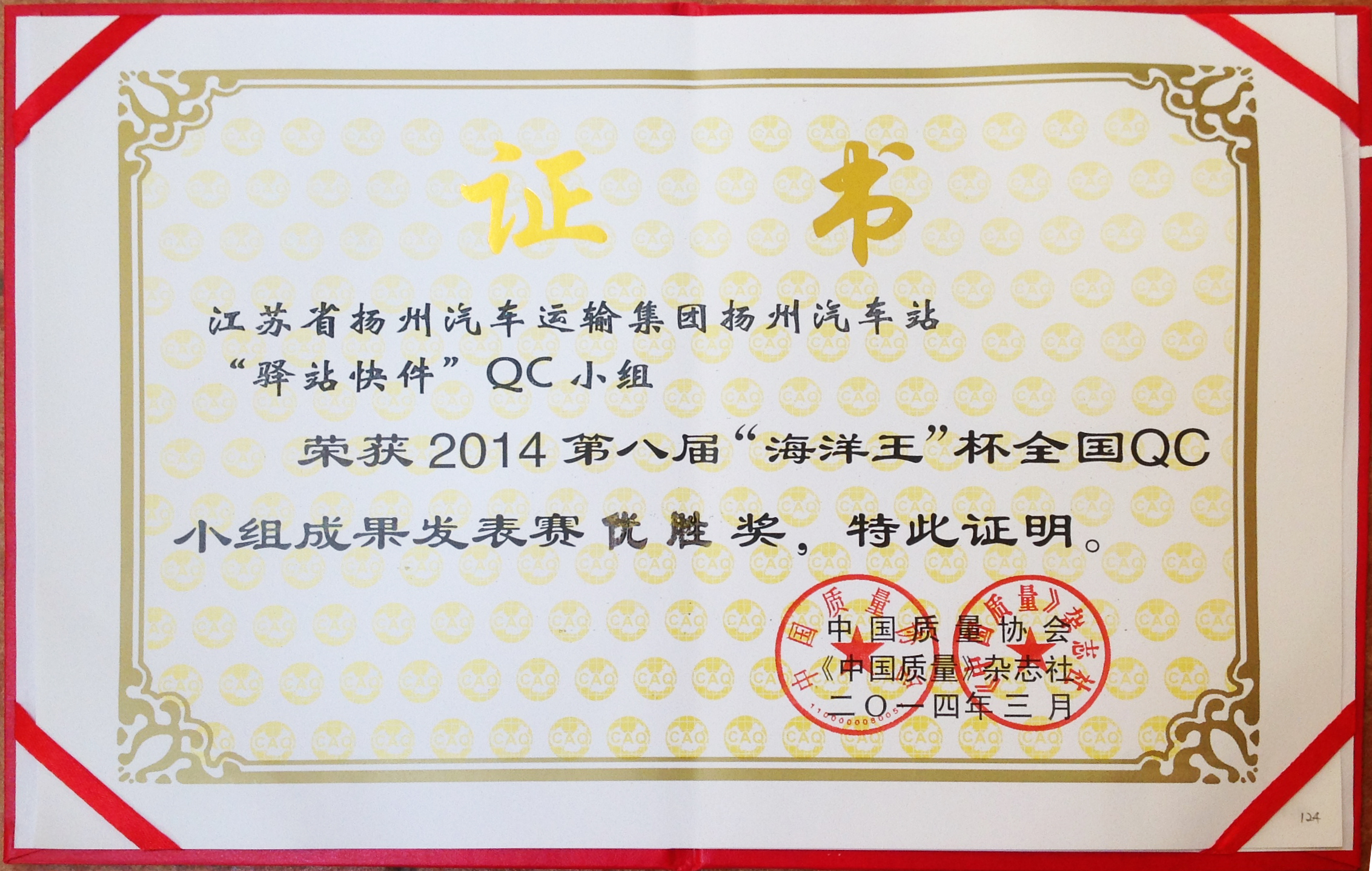 “海洋王”杯QC小組發(fā)表賽是一項(xiàng)全國性比賽,今年共有300多個(gè)成果報(bào)名,經(jīng)過層層選拔,來自全國各地QC小組代表500余人,197個(gè)成果參加現(xiàn)場發(fā)布。經(jīng)過5天緊張的成果發(fā)布,我司揚(yáng)州汽車站“驛站快件”QC小組成員余妍、潘潔發(fā)表的《降低到達(dá)庫收發(fā)貨的誤差率》在激烈的角逐中脫穎而出,獲得第八屆“海洋王”杯最高榮譽(yù)——優(yōu)勝獎(jiǎng),和其他47個(gè)成果一起被直接推薦為2014年度全國優(yōu)秀QC小組。