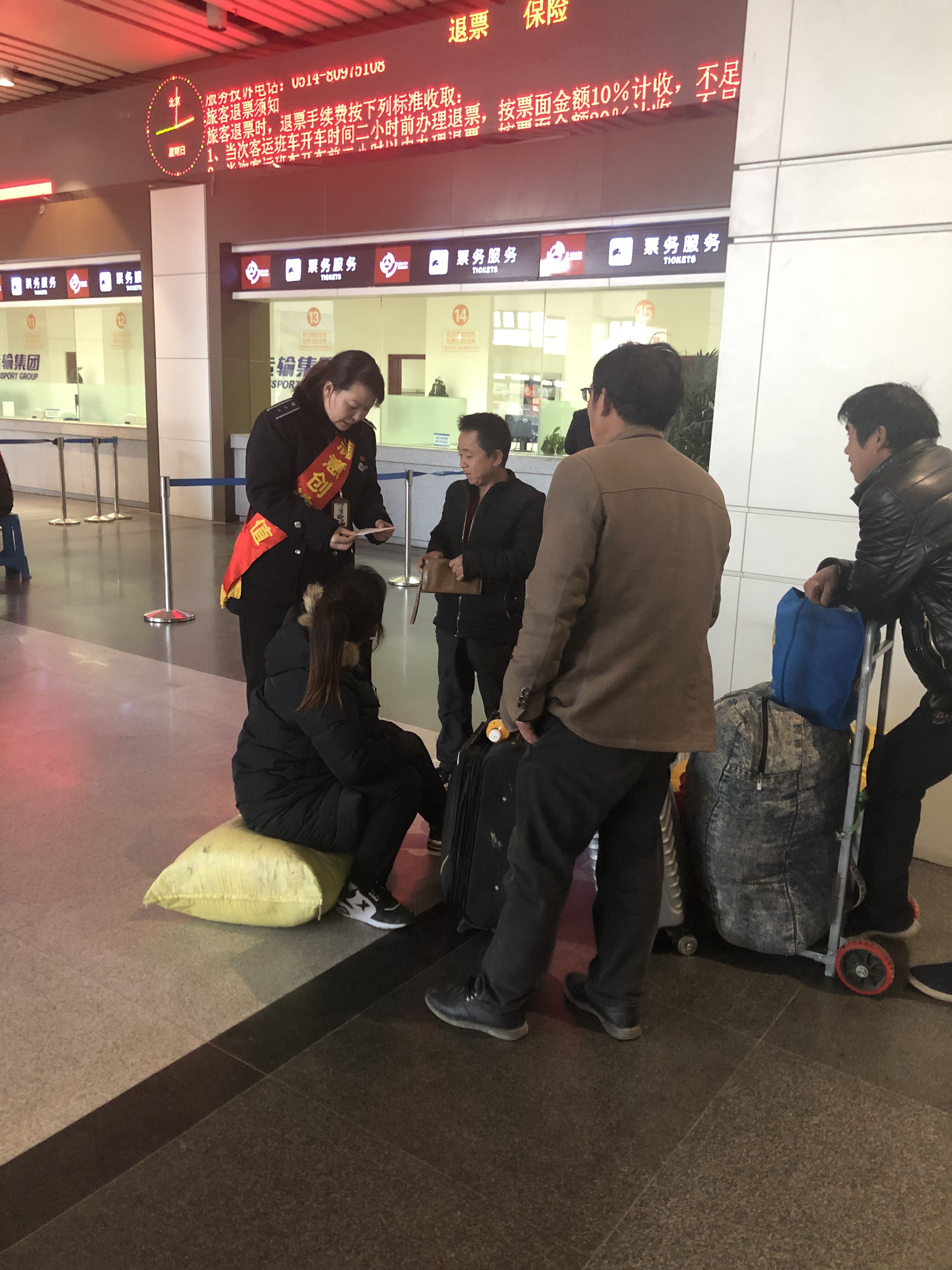 1月27日下午三點,服務(wù)班班長尹海霞在現(xiàn)場巡查時發(fā)現(xiàn),售票大廳一角有四個農(nóng)民工模樣的旅客,望著眼前一大堆行李,說著外地方言,不停地議論著。
