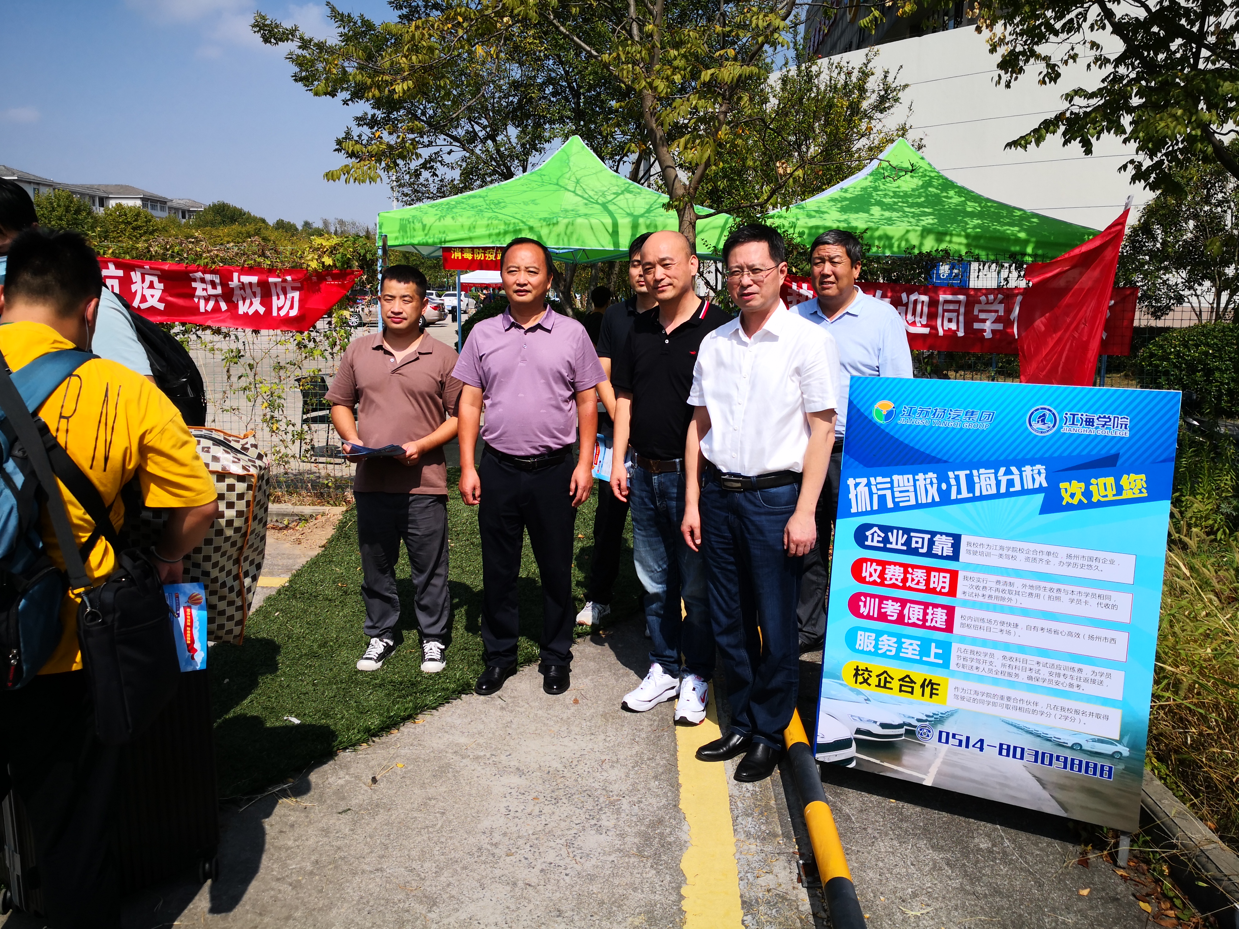 在江海學(xué)院咨詢點(diǎn),揚(yáng)汽駕校在校內(nèi)搭建了咨詢臺(tái)、遮陽(yáng)棚等設(shè)施,并制作宣傳海報(bào)、宣傳冊(cè)等,F(xiàn)場(chǎng)工作人員嚴(yán)格按照學(xué)校疫情防控工作部署要求,落實(shí)落細(xì)各項(xiàng)措施,有序引導(dǎo)學(xué)生通過(guò)訓(xùn)練場(chǎng)內(nèi)設(shè)置的專用通道前往學(xué)校報(bào)到點(diǎn),并協(xié)助學(xué)校工作人員查驗(yàn)健康碼、測(cè)量體溫等,同時(shí)向?qū)W生及家長(zhǎng)分發(fā)招生宣傳冊(cè),詳細(xì)講解揚(yáng)汽駕校收費(fèi)透明、訓(xùn)考便捷、服務(wù)至上等優(yōu)勢(shì),耐心解答學(xué)生及家長(zhǎng)的學(xué)駕問(wèn)題,為下一步更好地開(kāi)展報(bào)名培訓(xùn)工作奠定了良好的基礎(chǔ)。