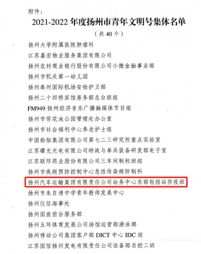 近日,團市委下發(fā)的《關于命名2021-2022年度市級青年文明號的決定》,揚汽集團東部樞紐汽車站防疫班榮獲青年文明號集體榮譽。