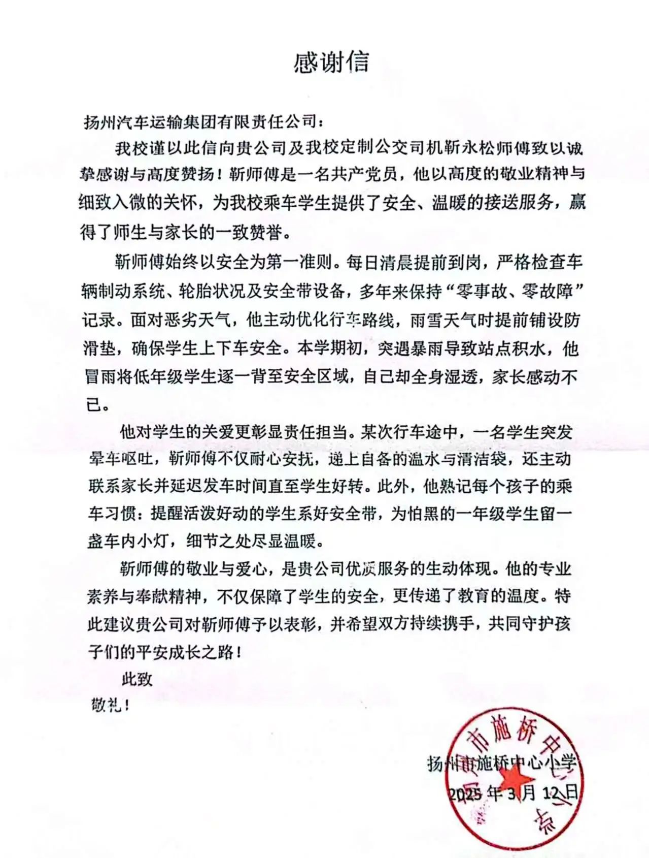 近日,揚汽集團營銷中心收到來自揚州市施橋中心小學的感謝信,對校車司機靳永松師傅盡職盡責的安全護送服務以及對學生們的悉心照顧表示衷心的感謝。